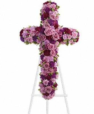 Our florists have created the Deepest Faith arrangement to represent dignity, admiration, pride, and faith. This breathtaking standing cross is composed of lavender roses, cushion spray chrysanthemums, purple and fuchsia carnations, and button spray chrysanthemums. It serves as a fitting tribute to an individual's spiritual devotion during a challenging time.